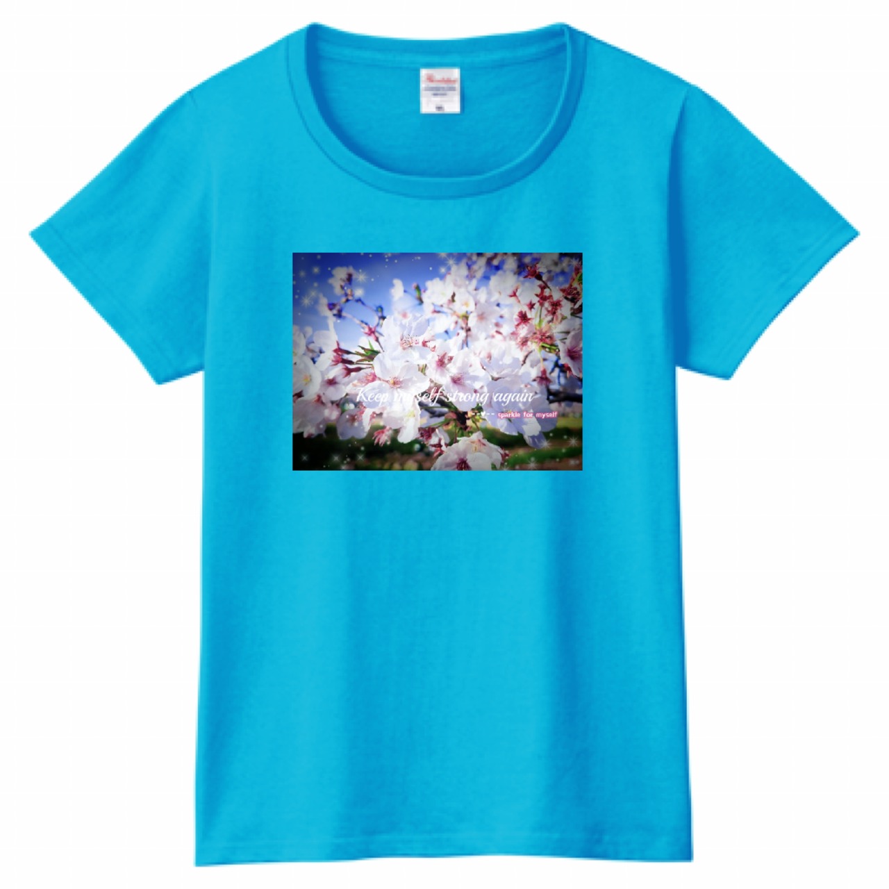 [Dark]♠キラキラCherry blossomTシャツ☁ヘビーウェイトTシャツ☁Ladies〔Printstar✵੯•`໒♥Sea blue